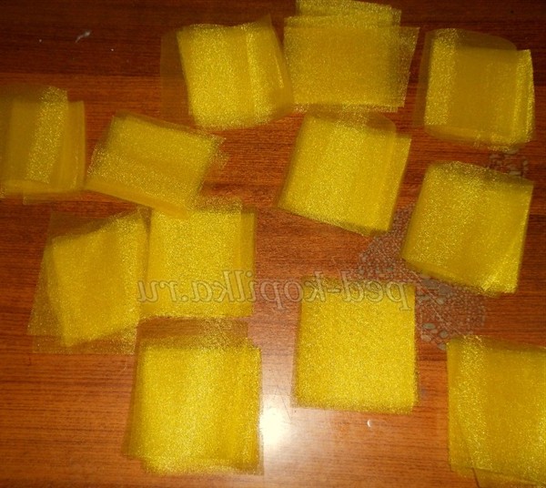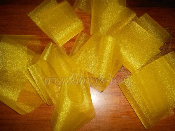 Нарізаємо жовтого кольору з органзи, квадратики 7 на 7 см