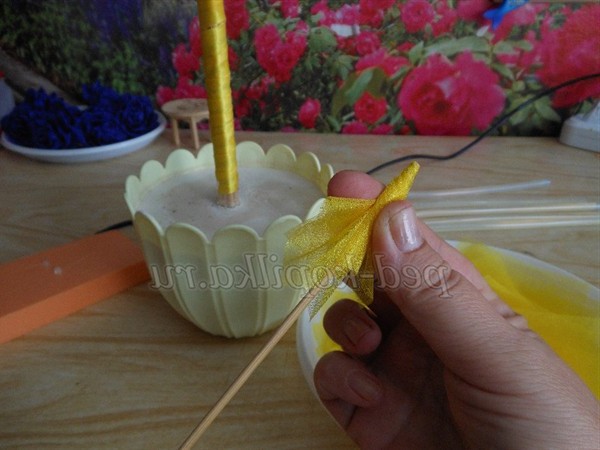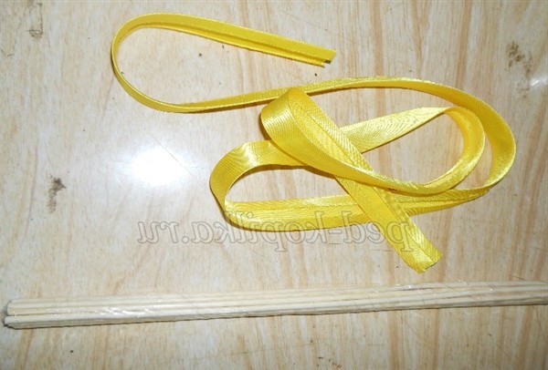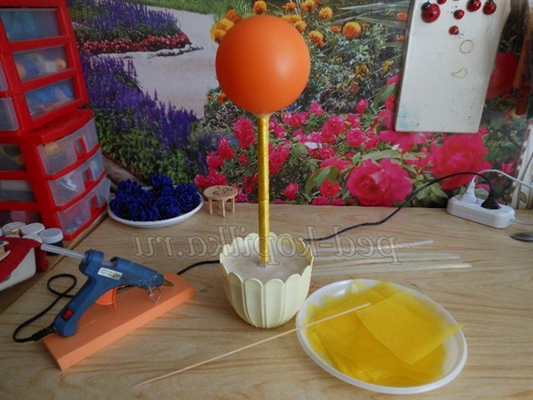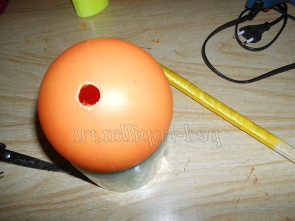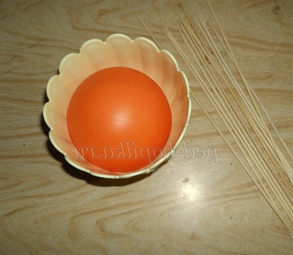 Ми беремо, 7 шпажок обмотуємо, їх жовтою стрічкою і вставляємо в готовий отвір у кульці