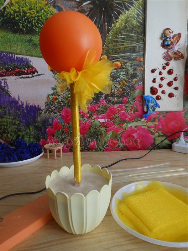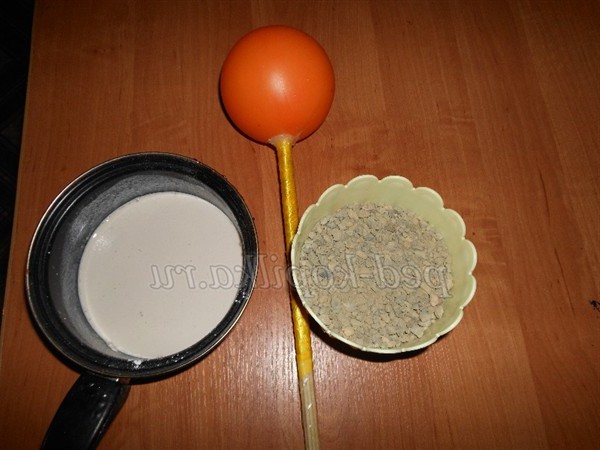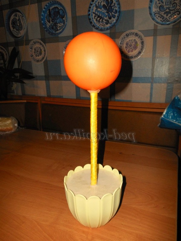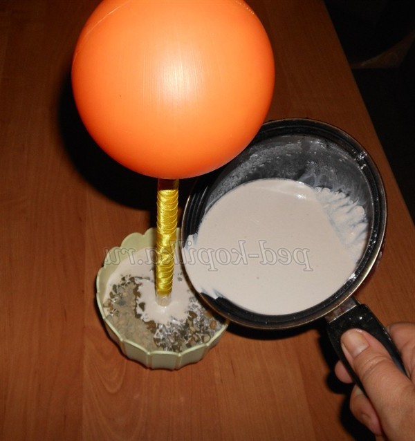 Готуємо розчин гіпсу, вставляємо паличку з кулькою в горщик і заливаємо гіпсом