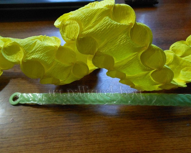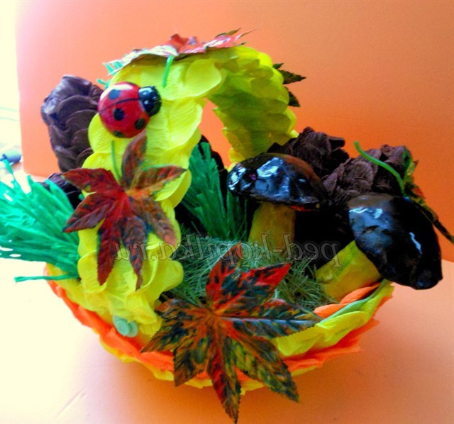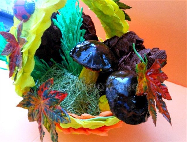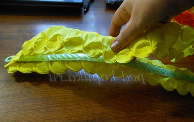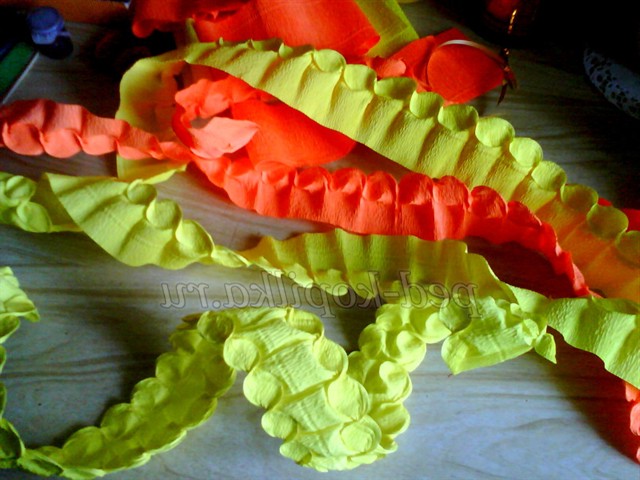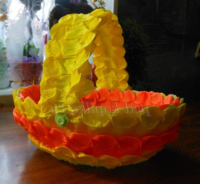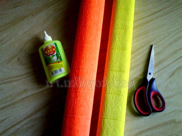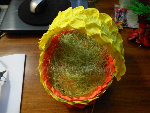 Тепер будемо оформляти, кошик беремо, папір помаранчеву і жовту, нарізаємо смужки дві помаранчевих і дві жовтих, скручуємо, як ми робили шишку це і буде окрасою нашої кошики