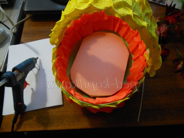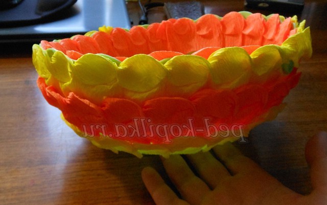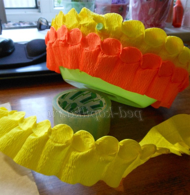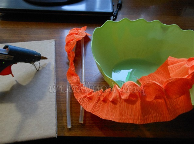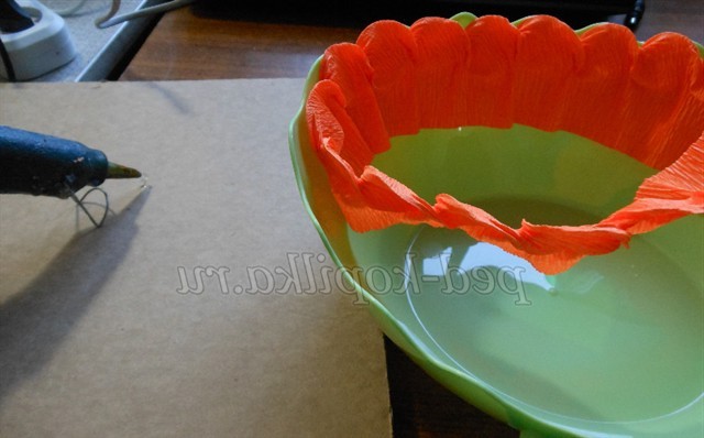За допомогою клейового пістолета ми пластмасову миску обклеюємо спочатку всередині як обідок, а потім зовні чергуючи кольору
