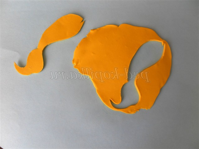 Робимо деталі панно. На пластилінову корж жовтого кольору кладемо трафарет і акуратно канцелярським ножем прорізаємо пластилін по контуру трафарету.