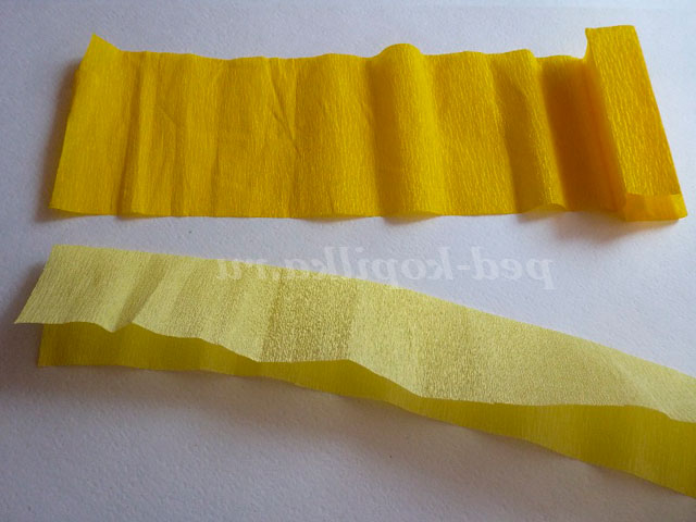 Потім вирізати з жовтою гофрованого паперу різних тонів смужки 6*25 см, скласти навпіл і розрізати на дрібні смужки.