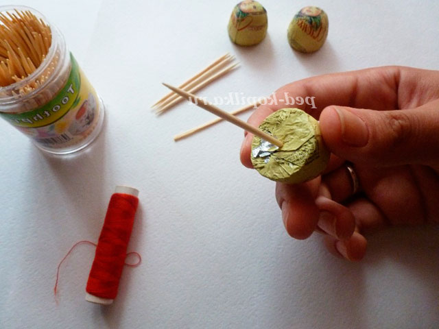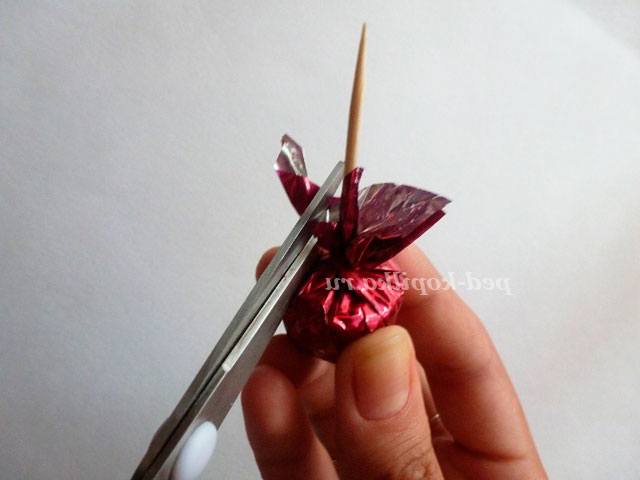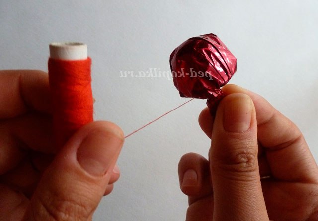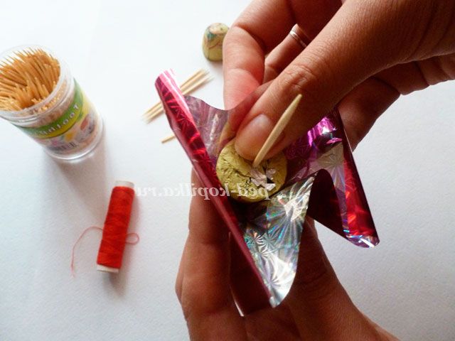 Обернути цукерку квадратиком плівки Полисилк, закрутити хвостик і закріпити його ниткою.