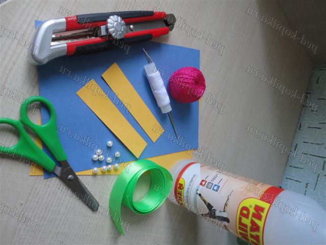 1. Для виготовлення рамки для фотографій «Квіти» необхідно: щільний тонований картон синього кольору (21х15,5 див. - 1 шт.), жовтого кольору (15.5х17 див. - 1шт; 16х2 див. - 2 шт.), тасьма зеленого кольору шириною
