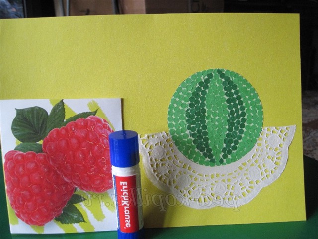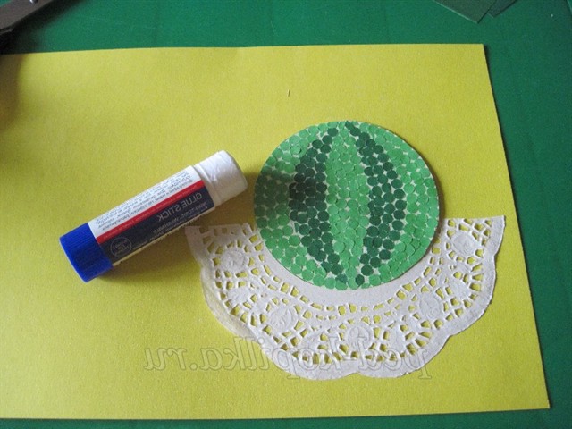 На аркуш жовтого картону приклейте половину серветки, потім - кавун.