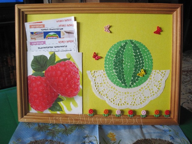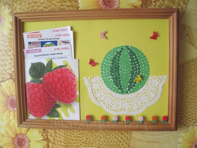 Мами часто записують або вирізують з журналів рецепти різних страв. Щоб вони завжди були під рукою, я пропоную виготовити для мам кишенька для дрібниць, прикрашений мозаїчним арбузиком.