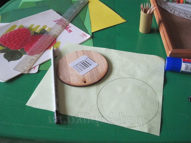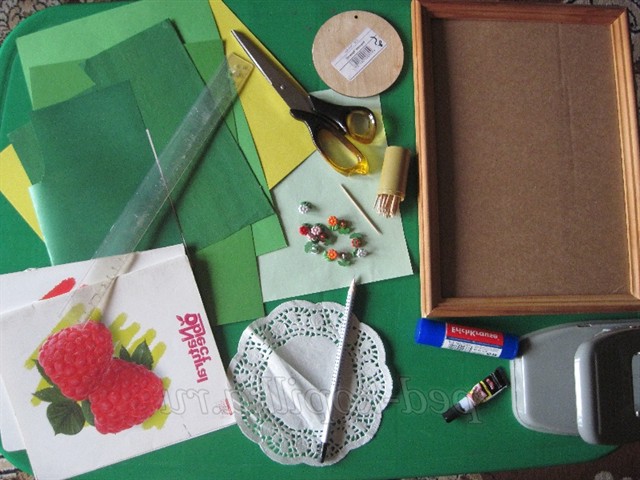 Для його виготовлення вам знадобляться: папір зеленого кольору трьох відтінків, лист картону жовтого кольору розміру А4, паперова ажурна серветка (такі в багатьох кафе підставляють під чашку з кавою), паперова обгортка від старої зошити з річним малюнком, декоративні гудзики у вигляді квіточок і метеликів (відрізала від старого дитячого платтячка), рамка розміру А4 без скла (я знайшла вдома стару рамку з давно розбитим склом), простий олівець, лінійка, зубочистки, ножиці, клей-олівець, клей момент, дирокол, коло діаметром 9-10 див. (для трафарету) або циркуль.
