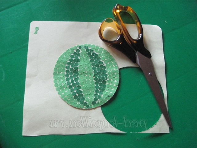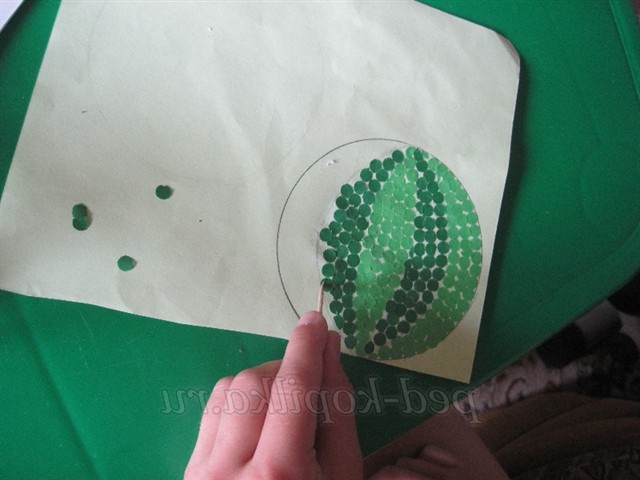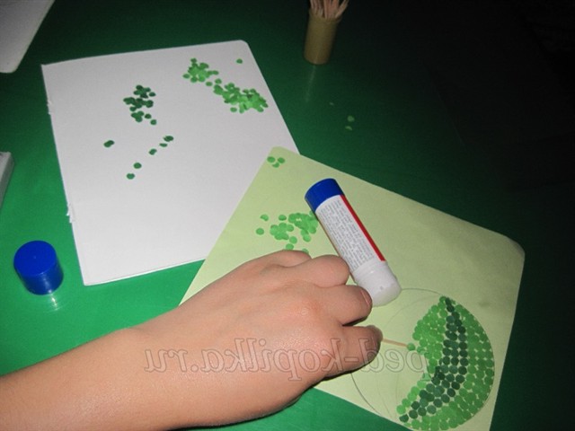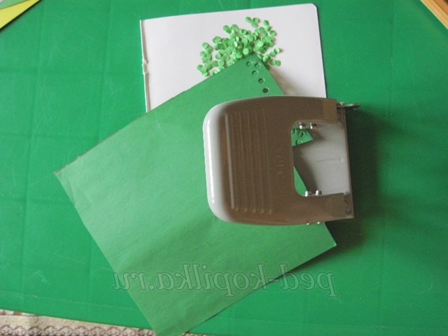 З допомогою діркопробивача з листів зеленого паперу заготовте елементи мозаїки - маленькі кружечки-конфетті.