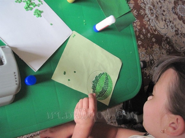 Найбільше влітку я люблю кавуни. Найдивовижніше в кавуні те, що його не смачно їсти одному, його їдять завжди з мамою і татом чи друзям. Я придумала зробити аплікацію кавуна в техніці мозаїка, і знайшла їй застосування.