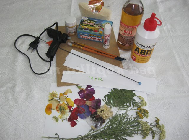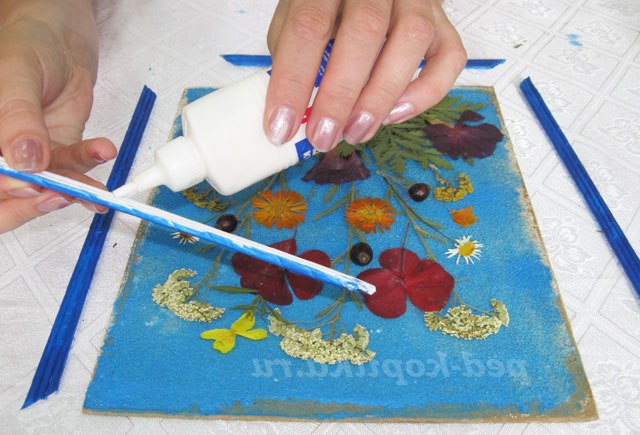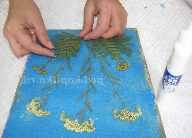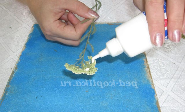 14. Після висихання фарби, приступаємо до декорування. Приклеюємо клеєм ПВА сухі гілочки і квіточки, залишки клею акуратно видаляємо серветкою.