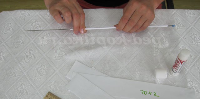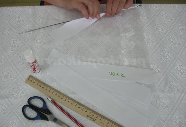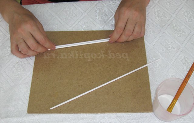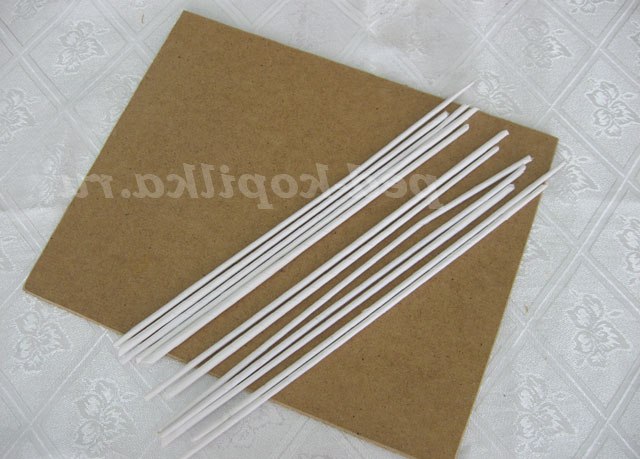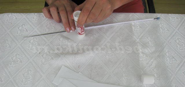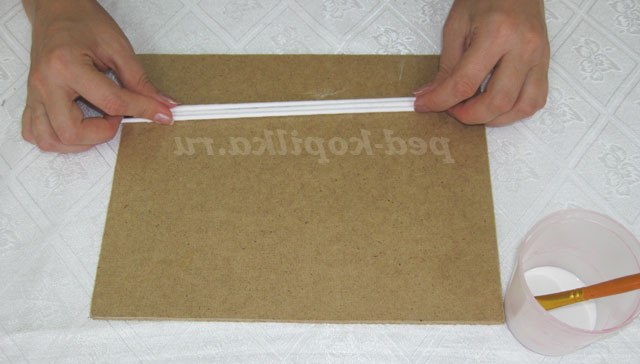 4. Поки наша основа підсихає, перейдемо до виготовлення рамки. Для цього беремо паперові смужки, накручуємо за куточок на спицю «в трубочку».