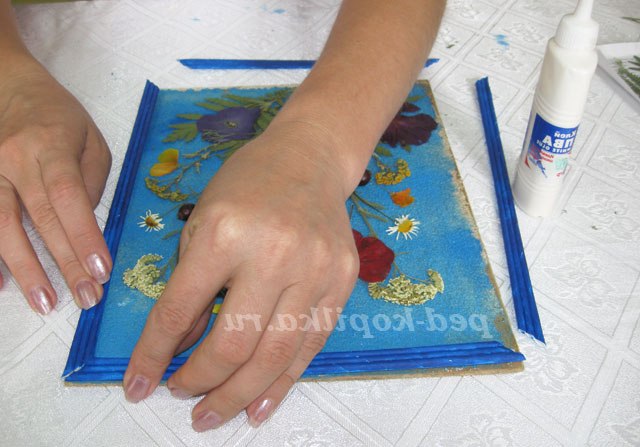 17. Ми підійшли до завершального етапу. Приклеюємо на клей ПВА елементи рамки. Кожну сторону треба трохи притримати, для більш міцного скріплення. (фото 30,31,32)