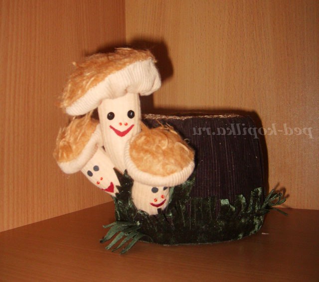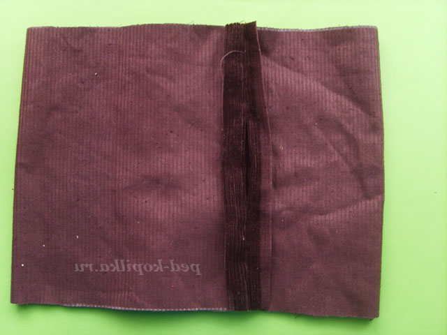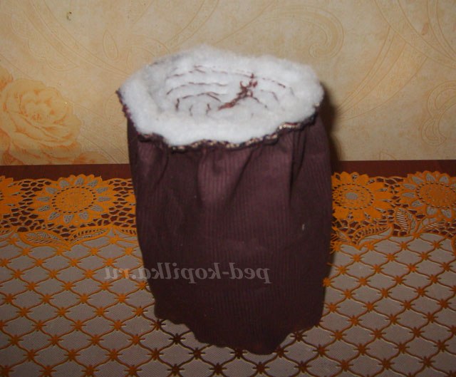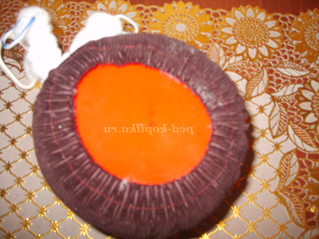 Вирізаємо прямокутник з коричневого вельвету (висота = висоті відра + припуск 6 см, довжина = довжині окружності кришки відра + припуск на шви). Зшиваємо короткі краю, залишивши невеликий відрізок посередині для того, що б вивести гриби.