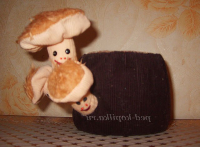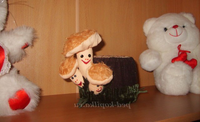 Таким же чином зробимо капелюшки інших грибів. Зробимо очі з пайетков, носики з бісеру, а ротик з червоного трикотажу.