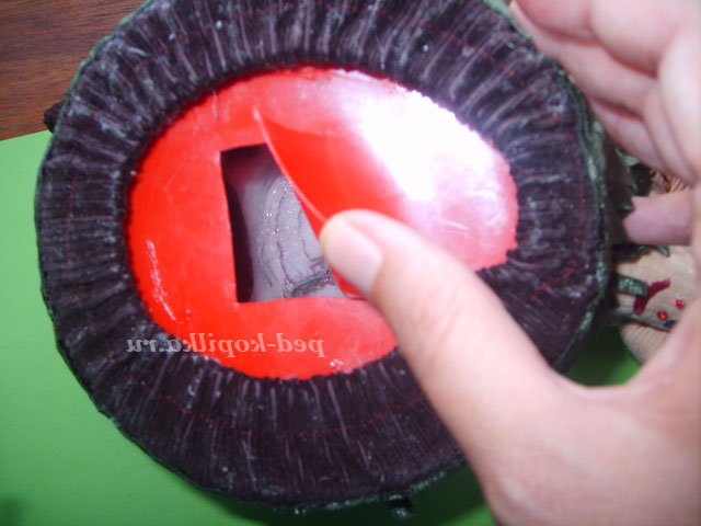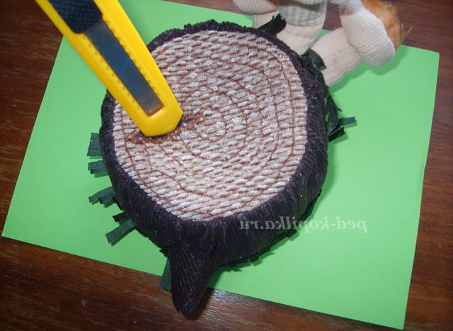 Робимо надрізи канцелярським ножем, повторюючи лінію тріщини пня для того щоб кидати гроші в скарбничку. На дні пня зробимо розріз буквою «П» і заклеїмо скотчем.