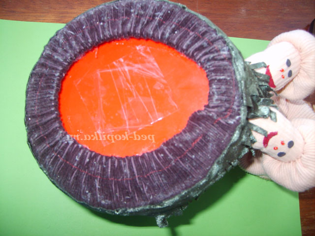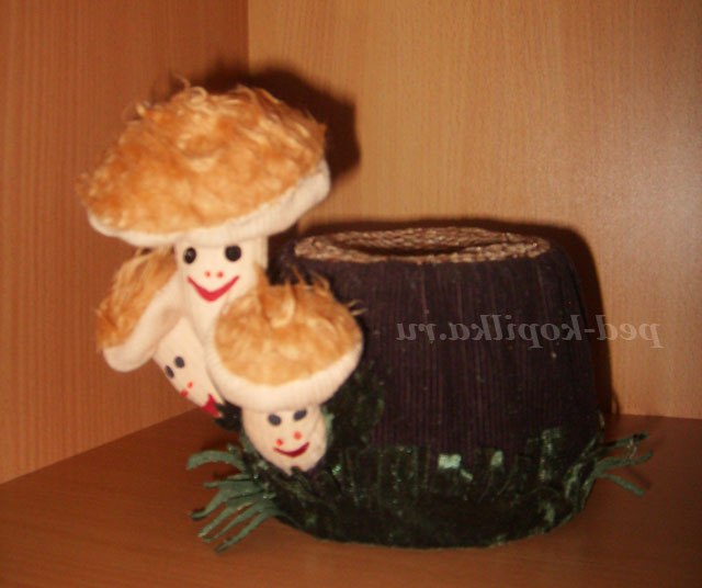 Прикрасимо підстава листочками грибів, вирізаними з зеленого оксамиту, приклеїмо травичку.