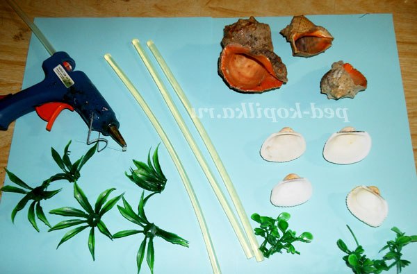 Тепер ми їх будемо кріпити за допомогою клею до наших мушель і прикрасимо декоративної травичкою