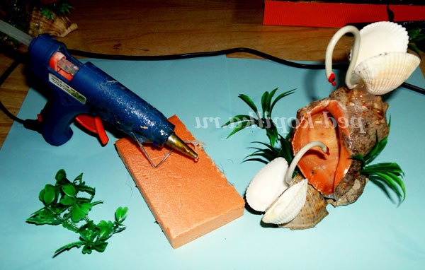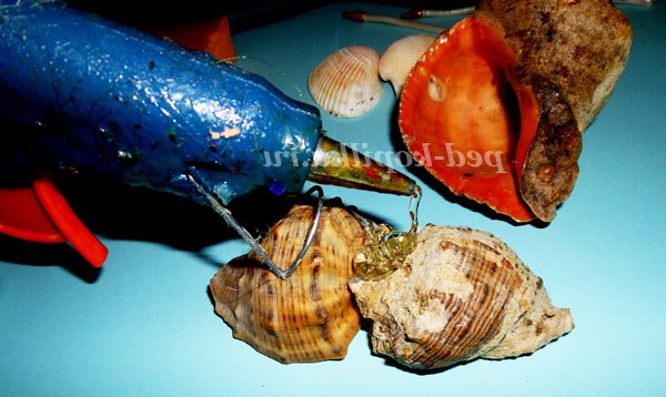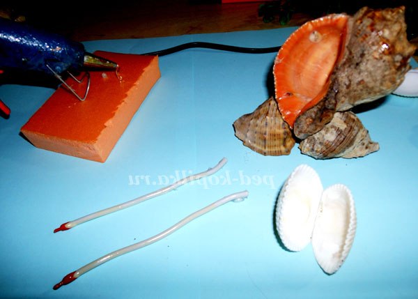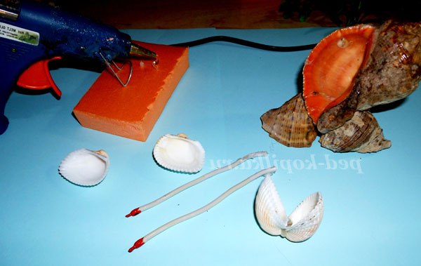Основу зробимо з трьох рапанів, спочатку склеюємо за допомогою пістолета два рапана