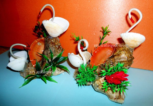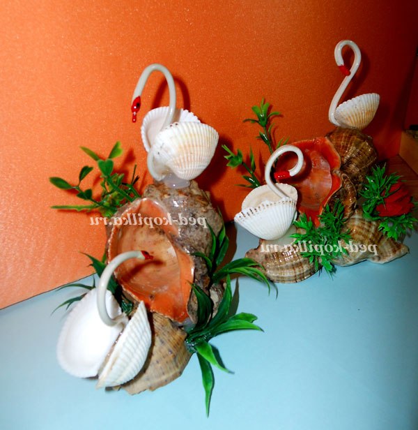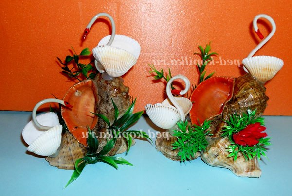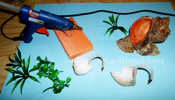 Тепер починаємо робити лебедів, дві білі мушлі склеюємо разом