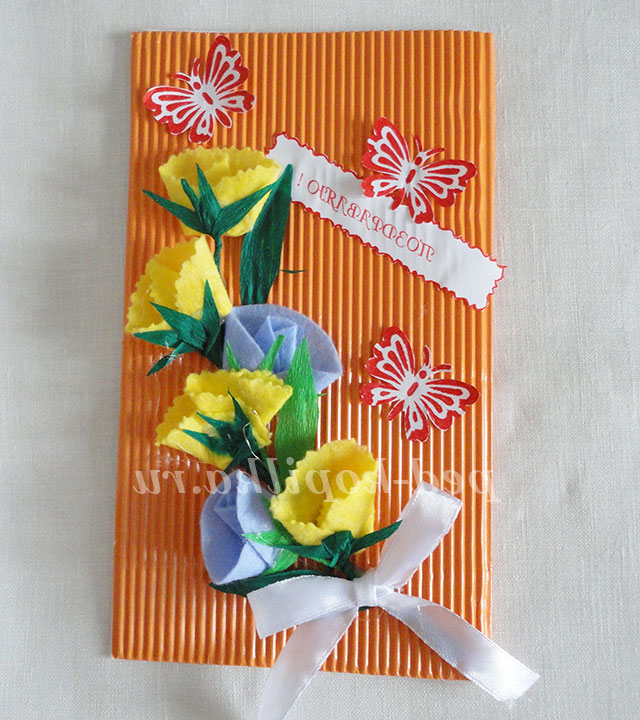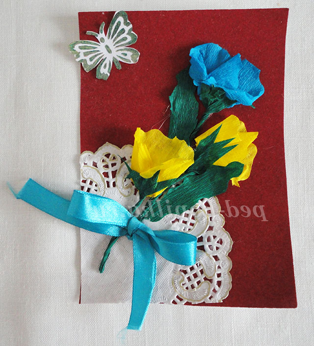Дана вітальна листівка проста у виготовленні, не потребує дорогих матеріалів і цілком під силу учням початкової школи. Ви отримаєте готову роботу протягом одного заняття.