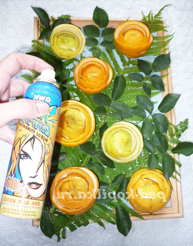 Для даної роботи підійде шкірка будь-яких цитрусових: мандаринів, апельсинів, лимонів, грейпфрутів. Від них буде залежати розмір і колір наших трояндочок.