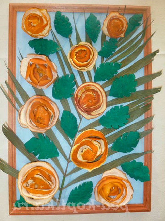 11. Така робота чудово прикрасить будь-який інтер'єр. На даній роботі листочки вирізані з шкірки помело і пофарбовані зеленою гуашшю