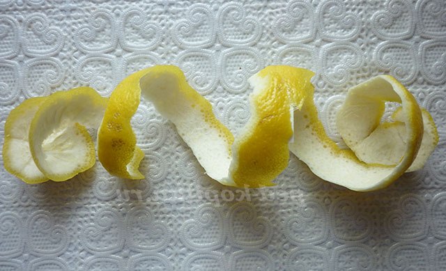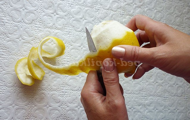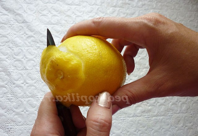 1. З допомогою ножа очищаємо лимон, починаючи з верхівки і по спіралі очищаємо весь лимон