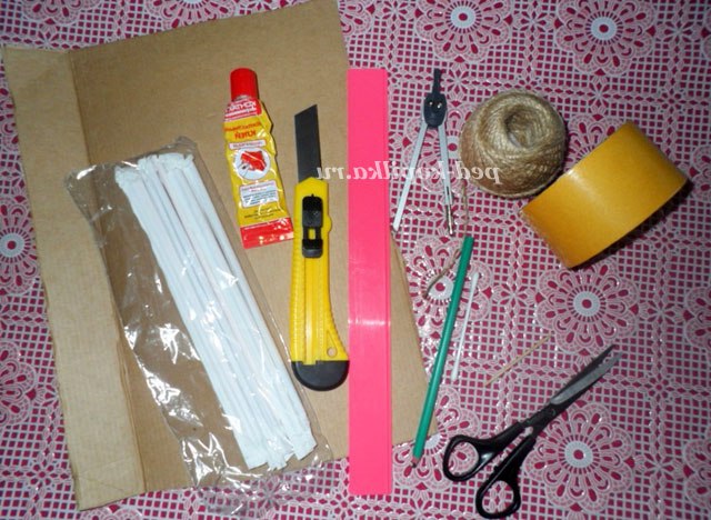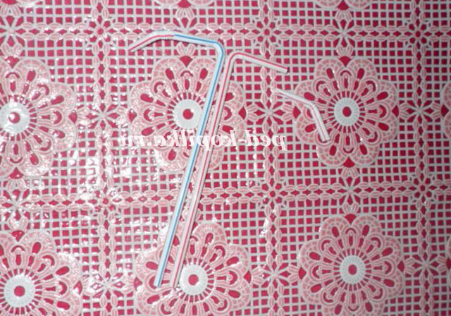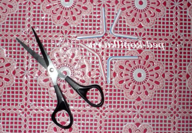 11. Беремо ще 4 трубочки. Будемо робити кермо. Дві обрізаємо з короткого кінця, залишаючи З см.. Від двох інших залишимо лише місце згину , сторони кута повинні бути на 1,5 см.. Вставляємо куточки в короткі сторони перших заготовок.