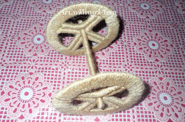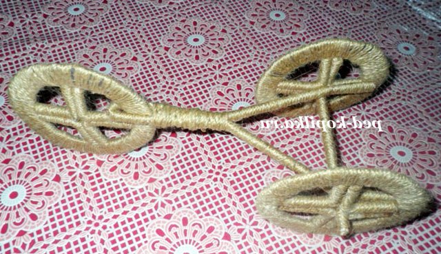 10. Другу деталь протягуємо в третє колесо (воно буде переднім), затискаємо і перетягуємо шпагатом за колесом. Кінці з'єднуємо деталі і склеюємо з віссю і двома колесами.