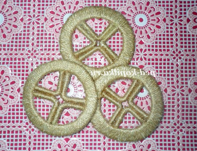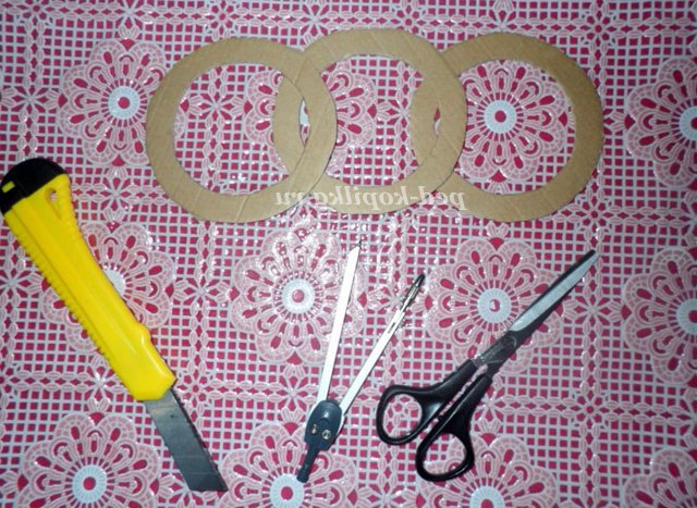 1. З картону вирізаємо 3 кола радіусом 5см. Всередині кожного кола з тим же центром креслимо коло радіусом 4 див. , акуратно вирізаємо канцелярським ножем. Отримуємо 3 заготовки коліс.