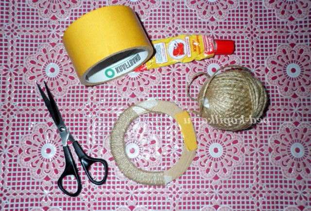 2. На кожну заготовку з двох сторін клеїмо тонкі смужки двостороннього скотча і обмотуємо шпагатом, приклеюємо.