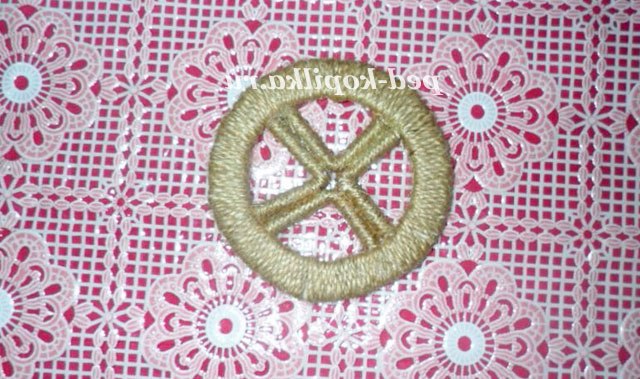 12. Обмотуємо отримані деталі шпагатом, з'єднуємо між собою (шпагатом щільно перемотувати посередині довгих сторін) і приклеюємо до переднього колеса.
