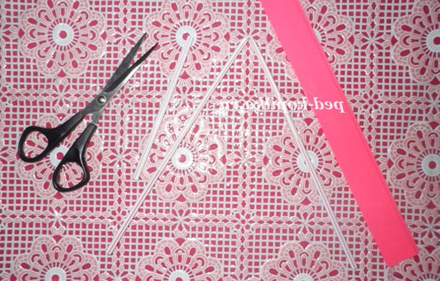 7. Беремо ще 3 трубочки. З них ми будемо майструвати раму для велосипеда (повинні зробити 2 заготівля). Довжина першої заготовки становить 11 див., а друга являє собою кут (вставляємо трубочку в трубочку і приклеюємо) зі сторонами рівними 20 див.