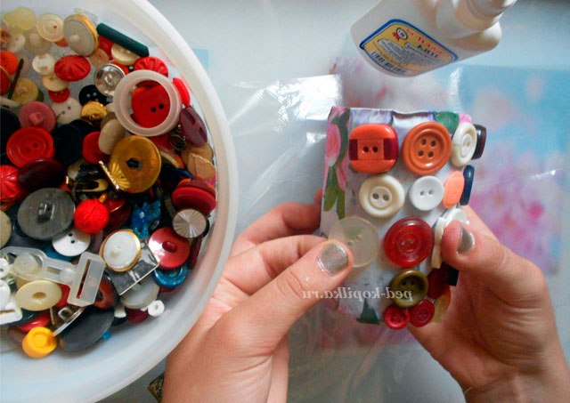 6. Скористаємося гудзиками різного кольору і розміру: прикріплюємо їх до нашої вироби, використовуючи клей момент.