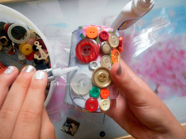 7. Акуратно наносимо клей момент на кожну ґудзик, потім притискаємо її до нашої банку і притримуємо пальцями, щоб клей злегка підсох.