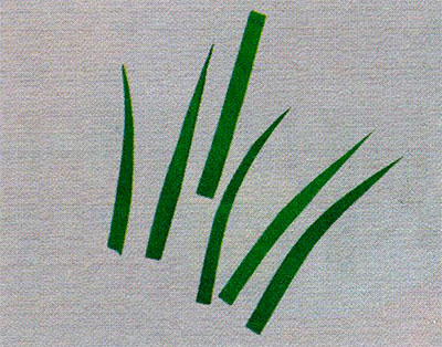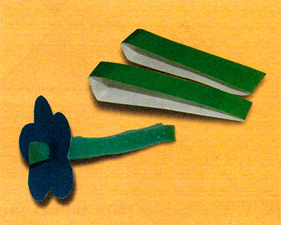 3. З зеленого паперу виріж стебельце і довгасті листя. Приклей квітка до стебла і листя.