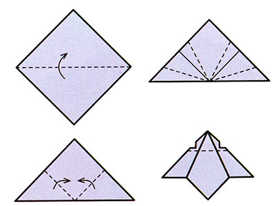 1. Візьми папір синього або фіолетового кольору, виріж з неї квадрат, зігни, як показано на схемі.