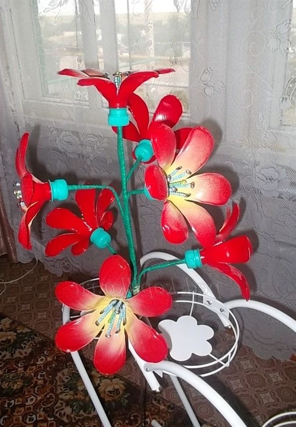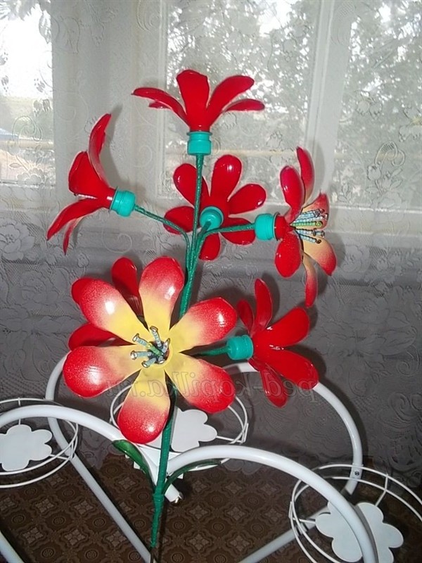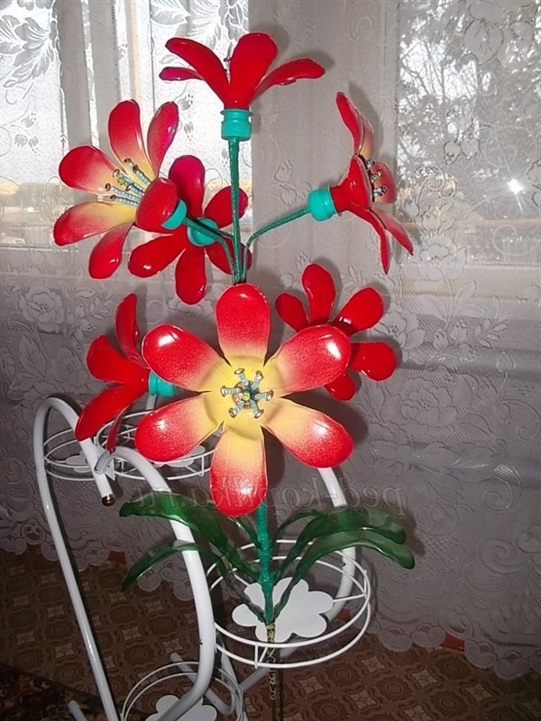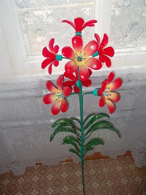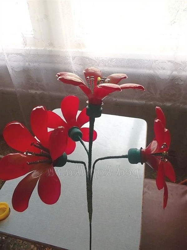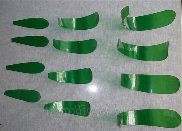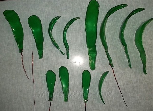 1. З пляшок (5-6 шт.) зеленого кольору вирізати листки довгастої форми різного розміру. Великих листків 8-10, поменше - 4 листочка, маленьких - 4 листочка.