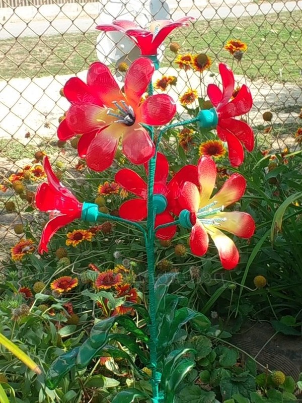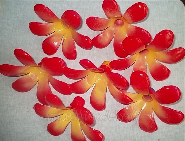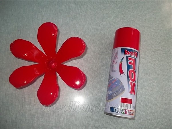 4. Потім офарбити в 2 шари кожен пелюстковий круг з двох сторін червоної алкідною фарбою. Фарбувати краще на вулиці. У лівій руці тримати квітка, надівши на руку целофановий пакет, а правою рукою рівномірно розпорошити на нього фарбу з балончика. Після висихання середину квітки пофарбувати жовтим кольором.