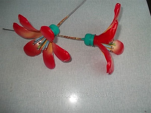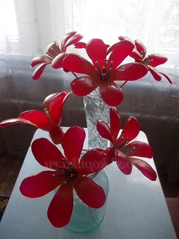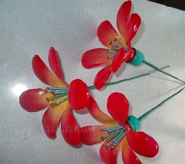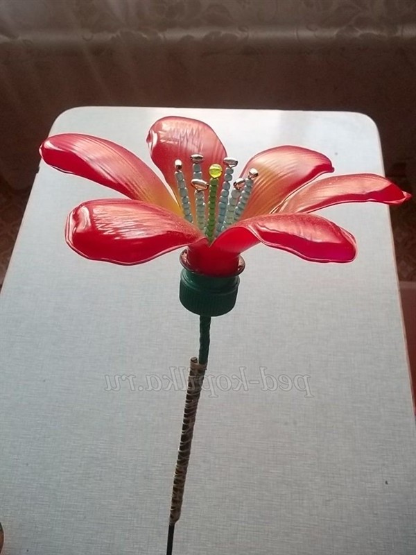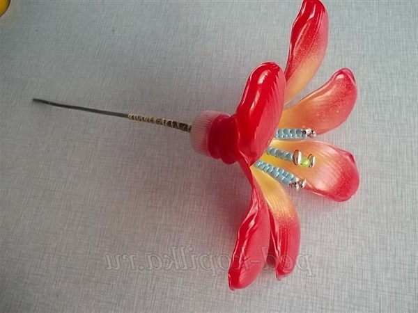5. Пробку проколоти спочатку шилом, а потім ножицями. В кришку налити трохи клею Майстер, а місце з'єднання тичинок і маточки добре змастити клеєм ПВА і протягнути в отвір в пробці, розправити тичинки. Готовий квітка поставити у вазу або банку до повного висихання клею.