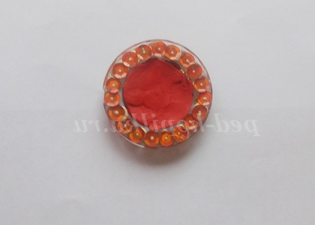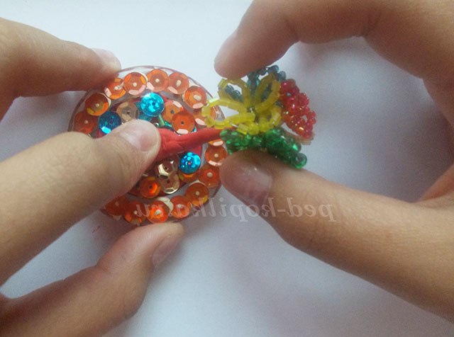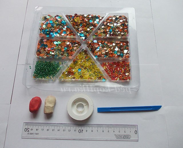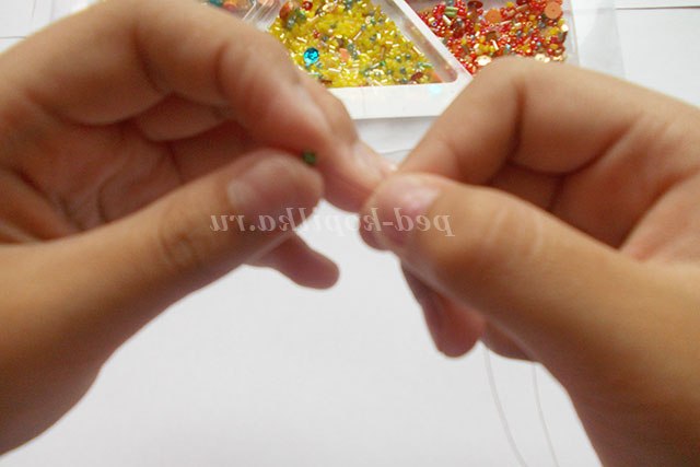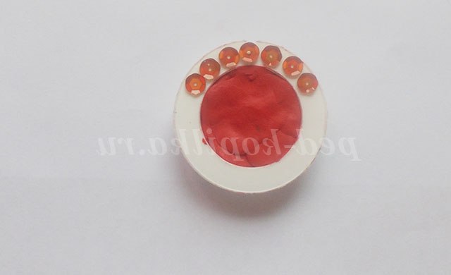 9. Беремо пластилін білого кольору відщипуємо її і прикладаємо до нижньої частини конфетті, потім конфетті накладаємо по краях котушки по колу.
