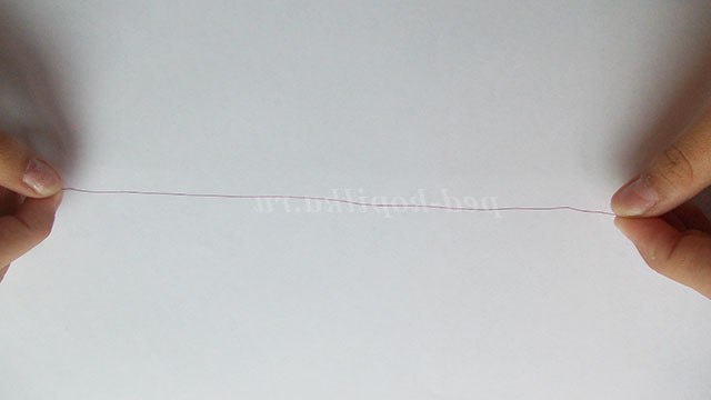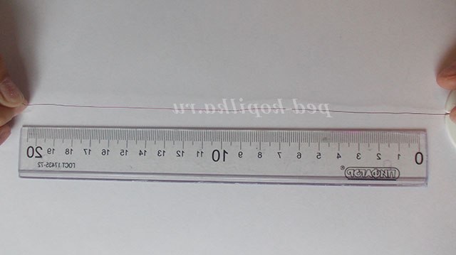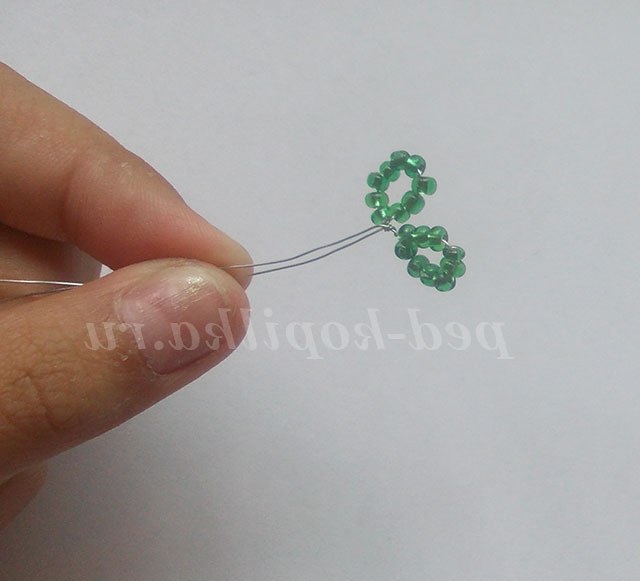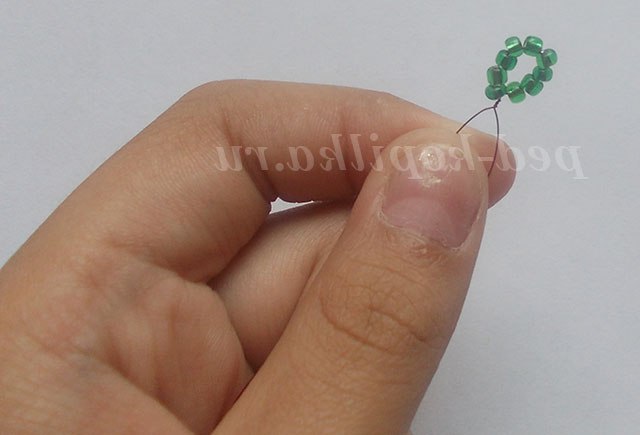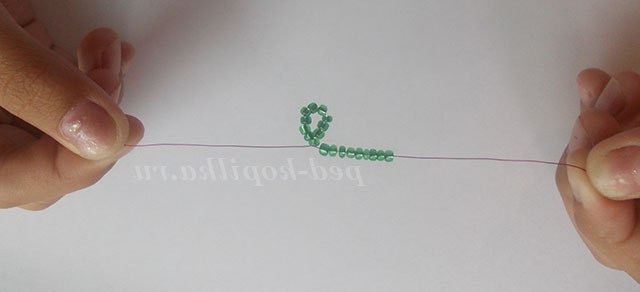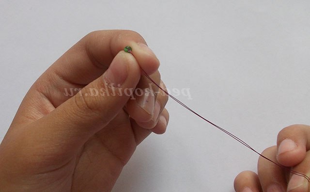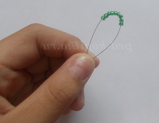 3. складаємо волосінь навпіл (фото 4) нанизуємо на неї бісеринки (фото 5) одного кольору (напр. зелений) до середини ліски , 9 штук (фото 6,7) , робимо петельку, скручуємо дріт (фото 8). По зовнішніх краях проводки робимо ще по 2 петельки (фото 9,10). На одному дроті робимо по 5 петельок - листочків (фото 11).