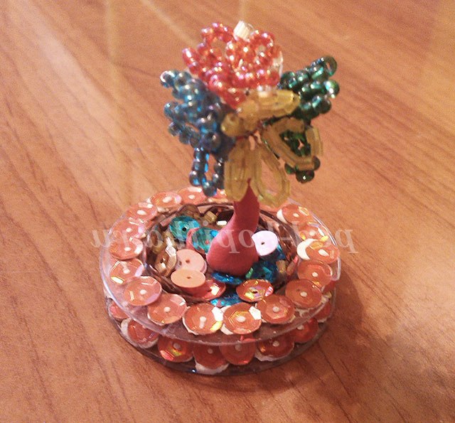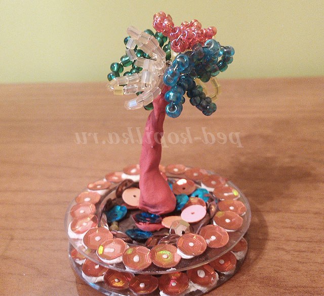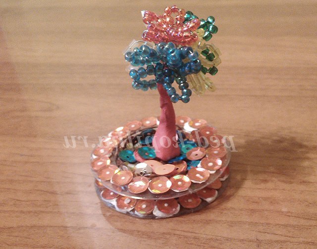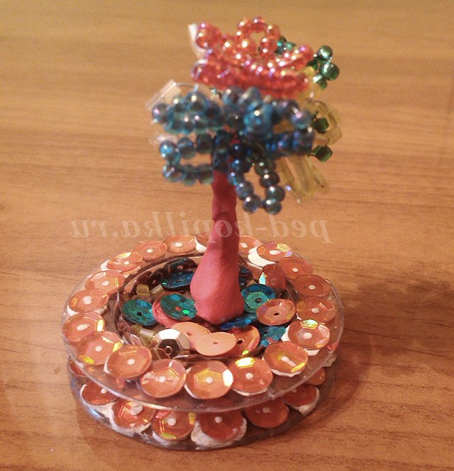 5. Ось у нас готове 5 гілочок з пелюстками різного кольору, з'єднуємо всі листочки, скручуємо залишки лісок між собою і у нас виходить стовбур дерева (фото 12), а зверху крона (фото 13).