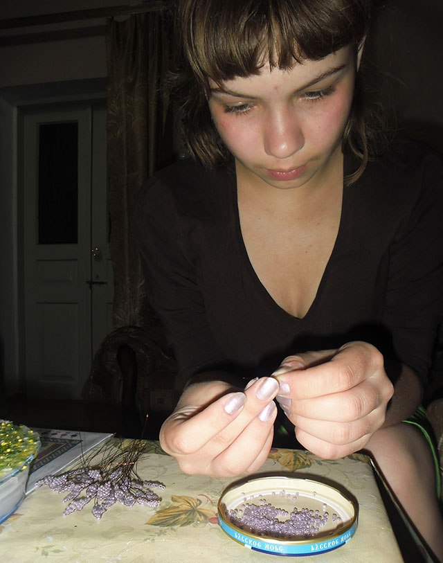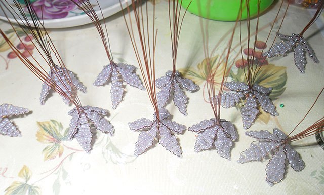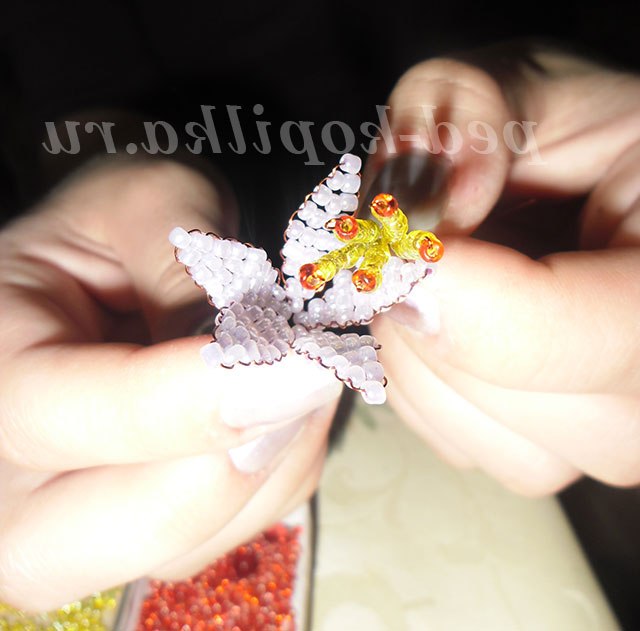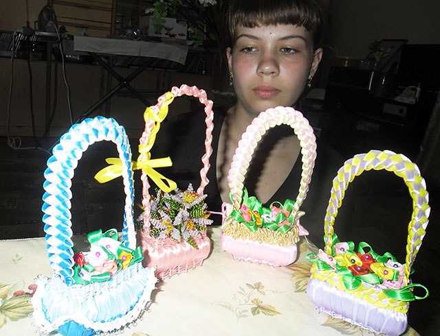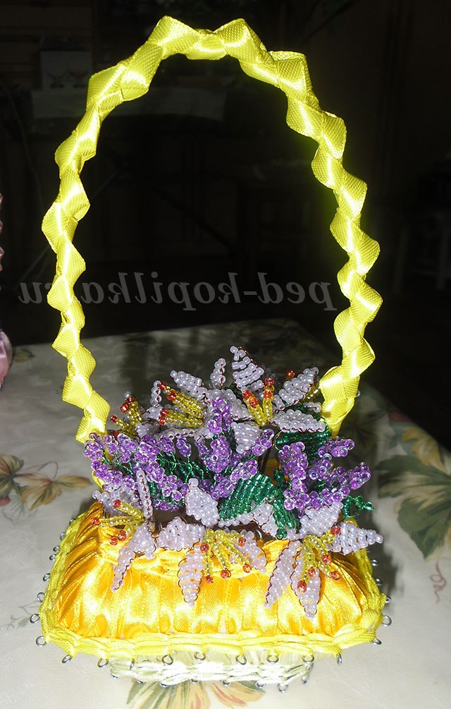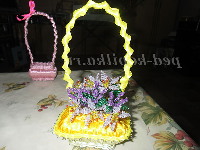 Квіти в першій кошичку зроблені з стрічок, це просто, а от у другій кошичку мені захотілося, щоб були квіти з бісеру. Виготовлення квітів.