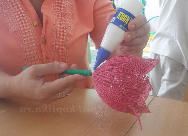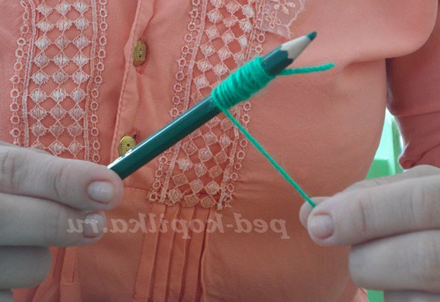 10. Потім треба зробити стебло квітки: обмотати олівець, змащений клеєм, зеленими нитками (5 штук).