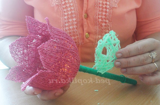 13. Із залишків зеленого кокона вирізати листя і приклеїти на стебло.