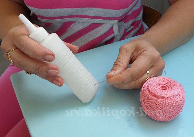 3. Кінець нитки протягнемо в голку і проколем нею пляшку з силікатною клеєм внизу. Голку знімемо, витремо і приберемо на місце.