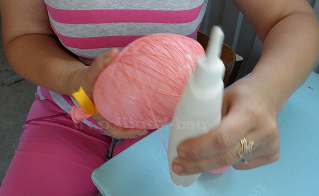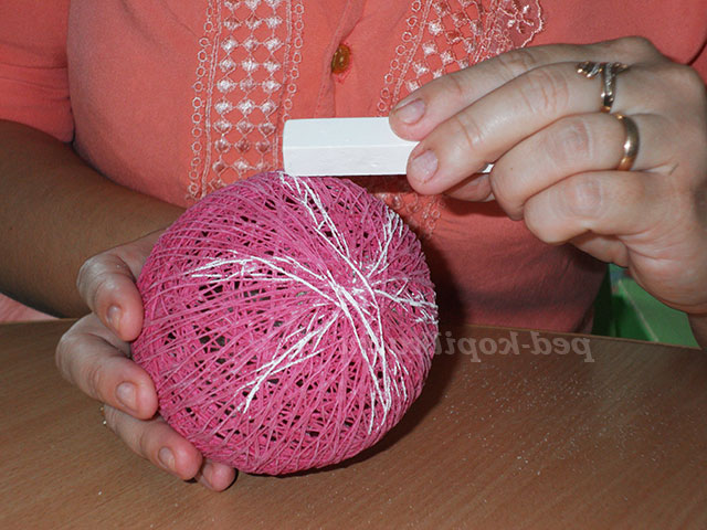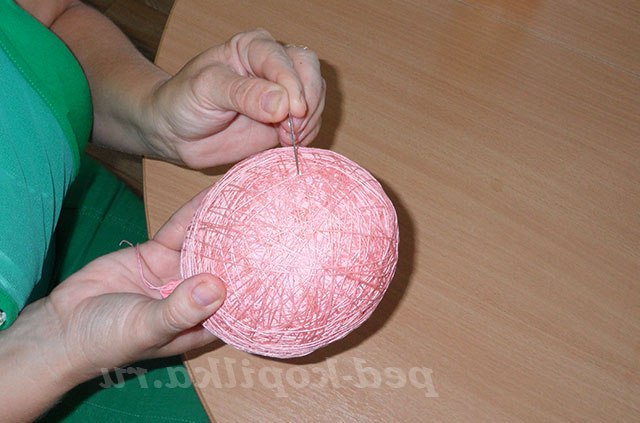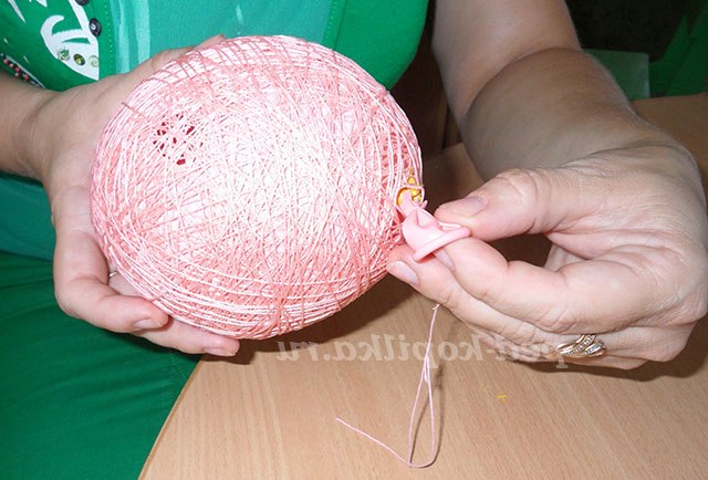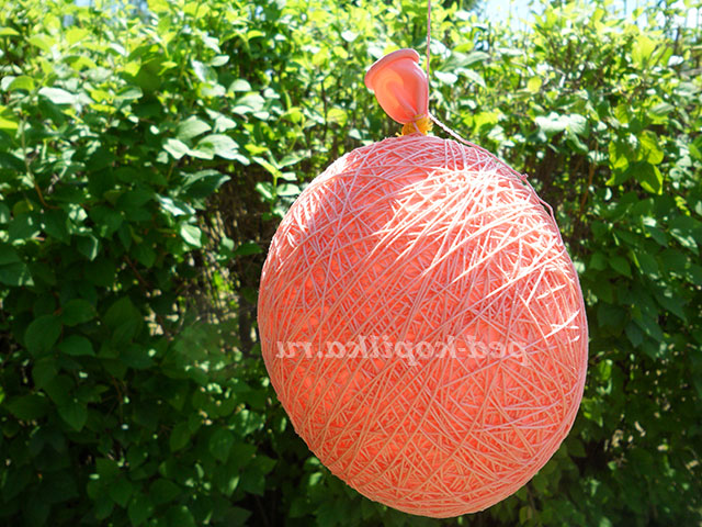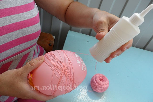 5. Після цього беремо в ліву руку повітряну кульку і починаємо, не кваплячись, обмотувати його просоченої клеєм ниткою - робити кокон.