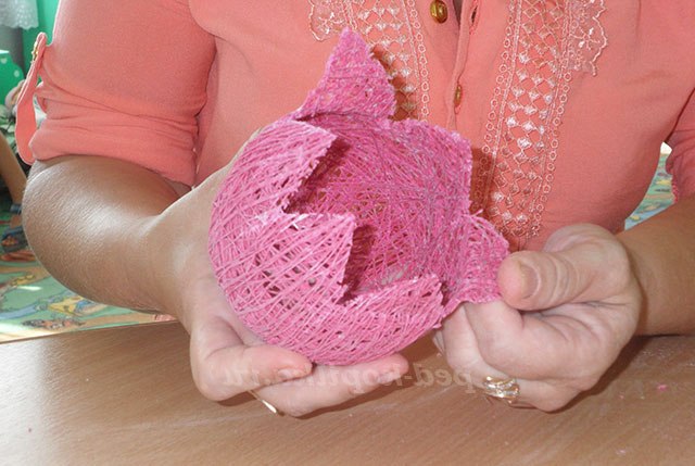 14. З великого кокона зробити вазу для квітів, розрізавши його навпіл і прикрасити стразами або намистинами, наповнити всередині будь-якими нитками.